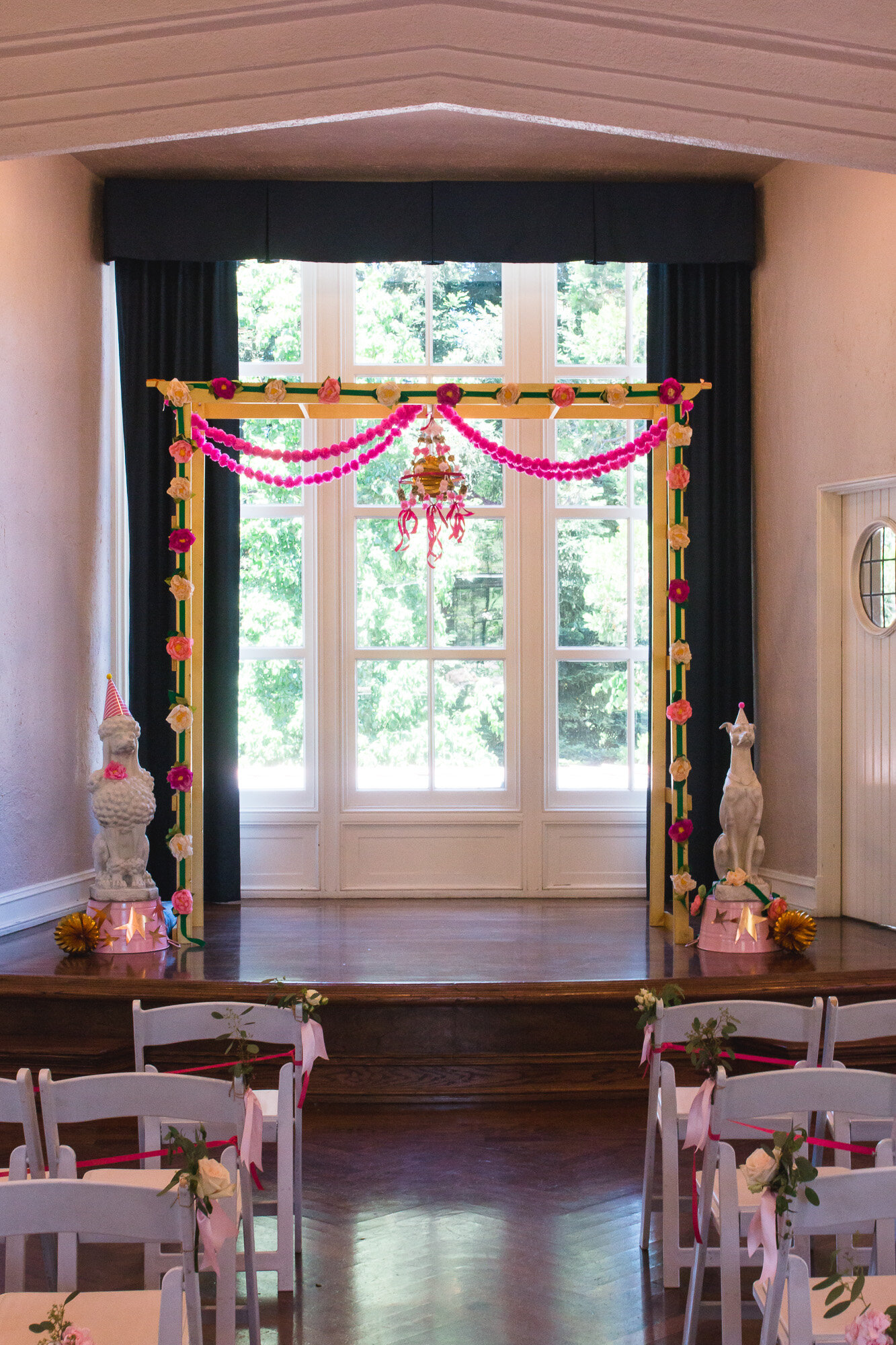 We’ve been to a lot of weddings over the years, but never to one this extra - the framed mixed media collage of the bride and groom riding a sports car to a carnival manned by Dolly Parton should be a tip-off to that. The whole day was full of incredible handmade details like this. The groom, Nate, created personalized coloring books, decorations for the altar, decorations for the several-foot-high dog sculptures that were perched all over the event, unreal numbers of paper flowers and gold stars and a handpainted photo backdrop and a million other little things that I’ve probably forgotten. Everything was touched with the lime green and pink wedding color scheme or with circus details like popcorn buckets full of flowers and spools of carnival tickets. They even hired a magician to perform illusions during the cocktail hour.